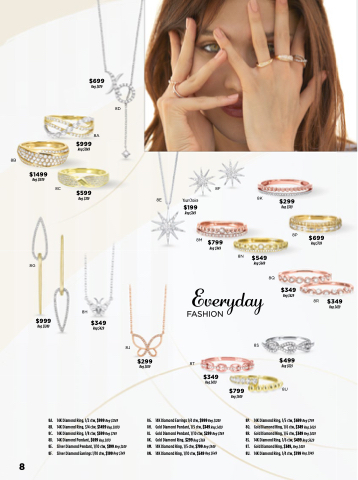 8G. 14K Diamond Earrings 1/4 ctw, $999 Reg $1249 8H. Gold Diamond Pendant, 1/5 ctw, $349 Reg $429 8J. Gold Diamond Pendant, 1/10 ctw, $299 Reg $369 8K. Gold Diamond Ring, $299 Reg $369