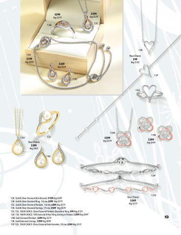 13E.-13G. YOUR CHOICE: Silver Diamond Pendant, Bracelet or Ring, $99 Reg $129 13H.-13K. YOUR CHOICE: 14K Diamond & Pearl Ring, Earring or Pendant, $399 Reg $499 13M. Gold Diamond Pendant, $299 Reg $379