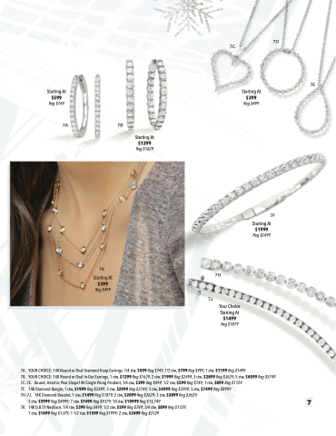 7C.-7E. Round, Heart or Pear Shape14K Single Prong Pendant, 1/4 ctw, $399 Reg $499; 1/2 ctw, $599 Reg $749; 1 ctw, $899 Reg $1129 7F. 14K Diamond Bangle, 1 ctw, $1999 Reg $2499; 2 ctw, $2999 Reg $3749; 3 ctw, $4999 Reg $5999; 5 ctw, $7499 Reg $8999 7H.-7J. 14K Diamond Bracelet, 1 ctw, $1499 Reg $1879; 2 ctw, $2099 Reg $2629; 3 ctw, $2899 Reg $3629;