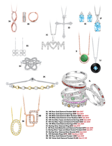 3I. 10K Rose Gold Malachite and Diamond Pendant $379 Sale $265 3J. Sterlng Silver Topaz and Black Enamel Pendant $109 Sale $76 3K. Sterling Silver Diamond Bolo Bracelet $319 Sale $223