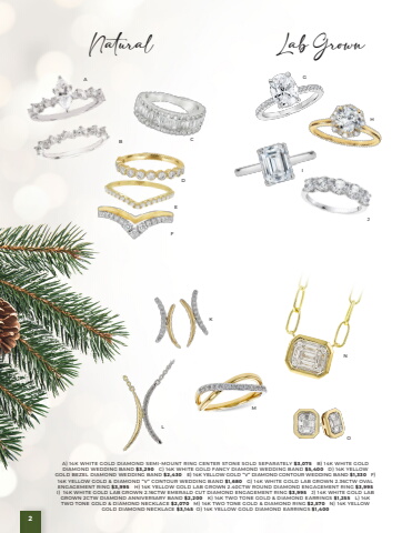 A) 14K WHITE GOLD DIAMOND SEMI-MOUNT RING CENTER STONE SOLD SEPARATELY $3,075 B) 14K WHITE GOLD DIAMOND WEDDING BAND $3,290 C) 14K WHITE GOLD FANCY DIAMOND WEDDING BAND $5,400 D) 14K YELLOW GOLD BEZEL DIAMOND WEDDING BAND $2,430 E) 14K YELLOW GOLD %u201cV%u201d DIAMOND CONTOUR WEDDING BAND $1,330 F) 14K YELLOW GOLD & DIAMOND %u201cV%u201d CONTOUR WEDDING BAND $1,680 G) 14K WHITE GOLD LAB GROWN 2.36CTW OVAL ENGAGEMENT RING $3,995 H) 14K YELLOW GOLD LAB GROWN 2.40CTW ROUND DIAMOND ENGAGEMENT RING $3,995 I) 14K WHITE GOLD LAB GROWN 2.16CTW EMERALD CUT DIAMOND ENGAGEMENT RING $3,995 J) 14K WHITE GOLD LAB GROWN 2CTW DIAMOND ANNIVERSARY BAND $2,200 K) 14K TWO TONE GOLD & DIAMOND EARRINGS $1,255 L) 14K TWO TONE GOLD & DIAMOND NECKLACE $2,070 M) 14K TWO TONE GOLD & DIAMOND RING $2,570 N) 14K YELLOW GOLD DIAMOND NECKLACE $3,145 O) 14K YELLOW GOLD DIAMOND EARRINGS $1,4002AB CDEFGHIJKMNOLNatural Lab Grown