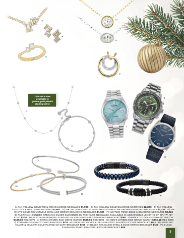 A) 14K YELLOW GOLD TOI & MOI DIAMOND NECKLACE $1,995 B) 14K YELLOW GOLD DIAMOND EARRINGS $2,895 C) 14K YELLOW GOLD TOI & MOI DIAMOND RING $1,995 D) 14K YELLOW GOLD ADJUSTABLE ROUND LAB GROWN DIAMOND NECKLACE $1,325 E) 14K WHITE GOLD ADJUSTABLE OVAL LAB GROWN DIAMOND NECKLACE $1,325 F) 14K TWO-TONE GOLD & DIAMOND NECKLACE $2,525 G) PLATINUM-BONDED STERLING SILVER DIAMONDS BY THE YARD NECKLACE AVAILABLE IN ADJUSTABLE LENGTHS OF 16%u201d, 17%u201d, 18%u201d & 20%u201d $200 H) PLATINUM-BONDED STERLING SILVER SIMULATED DIAMOND BRACELET $185 I) MEN%u2019S CITIZEN AUTOMATIC WATCH$427.50 REG $475 J) MEN%u2019S CITIZEN ECO-DRIVE WATCH $535.50 REG $595 K) MEN%u2019S CITIZEN ECO-DRIVE WATCH $355.50 REG $395 L) STERLING SILVER CZ CUFF BRACELET $132 M) STERLING SILVER & YELLOW GOLD PLATED CZ CUFF BRACELET $132 N) STERLING SILVER & YELLOW GOLD PLATED CZ CUFF BRACELET $165 O) BLACK STAINLESS STEEL & BLUE STITCH BRACELET $129 P) BLACK STAINLESS STEEL BRAIDED LEATHER BRACELET $693ABCDEFGHIJKLMNOPThis set is also available in yellow gold plated sterling silver