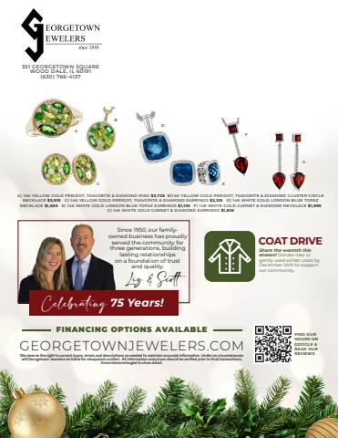 Liz & ScottSince 1950, our familyowned business has proudly served the community for three generations, building lasting relationships on a foundation of trust and quality.Celebrating 75 Years!351 GEORGETOWN SQUAREWOOD DALE, IL 60191 (630) 766-4137We reserve the right to correct typos, errors and descriptions as needed to maintain accurate information. Under no circumstances will Georgetown Jewelers be liable for misquoted content. All information and prices should be verified prior to final transactions. Some items enlarged to show detail.GEORGETOWNJEWELERS.COMA) 14K YELLOW GOLD PERIDOT, TSAVORITE & DIAMOND RING $3,725 B)14K YELLOW GOLD PERIDOT, TSAVORITE & DIAMOND CLUSTER CIRCLE NECKLACE $3,910 C) 14K YELLOW GOLD PERIDOT, TSAVORITE & DIAMOND EARRINGS $2,125 D) 14K WHITE GOLD LONDON BLUE TOPAZ NECKLACE $1,605 E) 14K WHITE GOLD LONDON BLUE TOPAZ EARRINGS $1,135 F) 14K WHITE GOLD GARNET & DIAMOND NECKLACE $1,895 G) 14K WHITE GOLD GARNET & DIAMOND EARRINGS $1,835 ABCDEFGCOAT DRIVEShare the warmth this season! Donate new or gently used winter coats by December 24th to support our community.FIND OUR HOURS ON GOOGLE & READ OUR REVIEWSFINANCING OPTIONS AVAILABLE