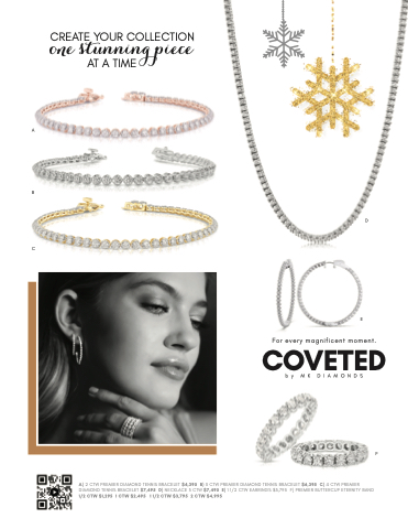 one stunning piece CREATE YOUR COLLECTION AT A TIME A B C D E COVETED by MK DIAMONDS F For every magnificent moment. A) 2 CTW PREMIER DIAMOND TENNIS BRACELET $4,395 B) 3 CTW PREMIER DIAMOND TENNIS BRACELET $6,395 C) 4 CTW PREMIER DIAMOND TENNIS BRACELET $7,495 D) NECKLACE 3 CTW $7,495 E) 1 1/2 CTW EARRINGS $3,795 F) PREMIER BUTTERCUP ETERNITY BAND 1/2 CTW $1,295 1 CTW $2,495 1 1/2 CTW $3,795 2 CTW $4,995