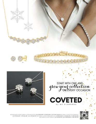 B C grow your collection D START WITH ONE AND ON EVERY OCCASION COVETED by MK DIAMONDS A) GRADUATED STONE FLOWER CLUSTER NECKLACE: 1/2 CTW $1,895 1 CTW $3,495 1 1/2 CTW $4,295 B) FLOWER CLUSTER STUD EARRINGS: 1/2 CTW $1,295 1 CTW $2,485 1 1/2 CTW $3,995 C) FLOWER CLUSTER TENNIS BRACELET: 3 CTW $7,995 5 CTW $11,995 7 CTW $14,995 D) FLOWER CLUSTER PENDANT: 1/2 CTW $1,795 3/4 CTW $2,495 1 CTW: $3,795 A