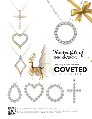 A B D The sparkle of C THE SEASON. For every magnificent moment. COVETED by MK DIAMONDS EFGH A) SINGLE DIAMOND CROSS PENDANT B) SINGLE DIAMOND HEART PENDANT C) SINGLE DIAMOND PENDANT D) SINGLE DIAMOND CIRCLE PENDANT 1/4 CTW $995 1/2 CTW $1,495 1 CTW $2,495 E) CLUSTER DIAMOND PEAR PENDANT F) CLUSTER DIAMOND HEART PENDANT B) CLUSTER DIAMOND CROSS PENDANT G) CLUSTER DIAMOND CIRCLE PENDANT 1/4 CTW $TBA 1/2 CTW $TBA 1 CTW $TBA